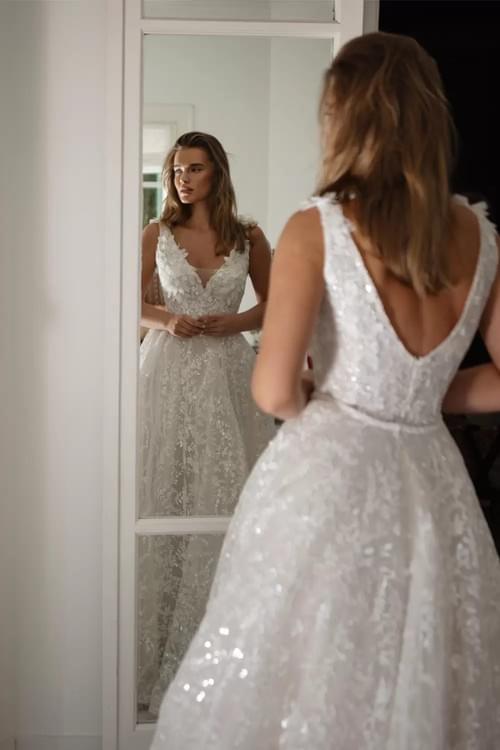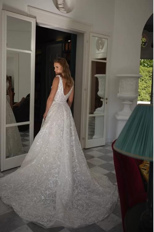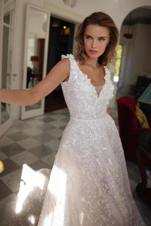 它採用可變換式(Transformable)設計,內層為一件修身的蕾絲迷你裙,外層則配備一條精緻的可拆卸圍裹式開衩長裙,讓新娘能在神聖莊重的儀式感與活潑輕便的晚宴造型間無縫切換。裙身鑲嵌有大量的 3D 刺繡花瓣、手工珍珠與細碎閃鑽,展現歐洲高訂婚紗特有的層次感與優雅魅力。