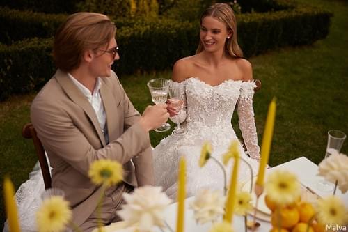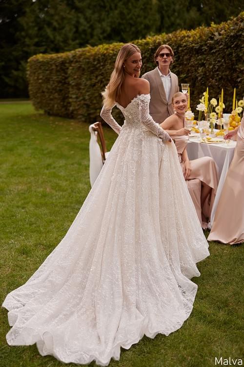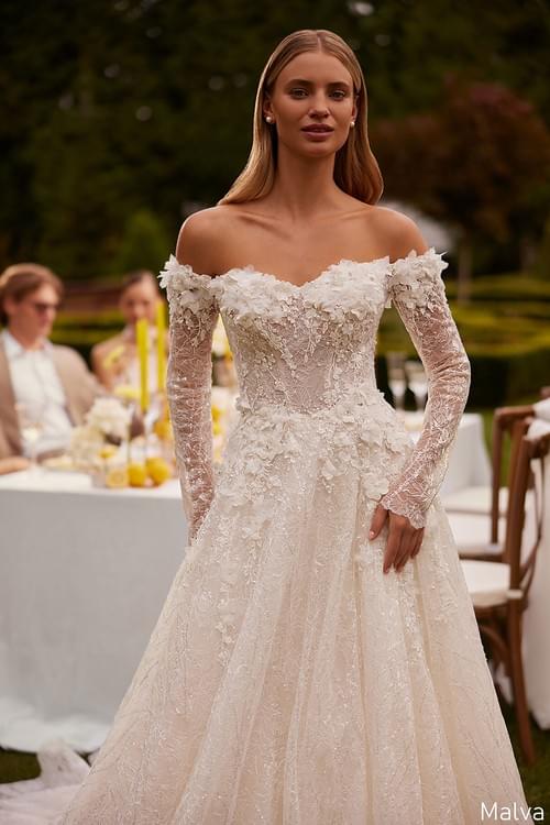 這款來自 Monreal Bridal 的 Malva 婚紗,設計核心在於營造如「浪漫夢境」般的夢幻氛圍。