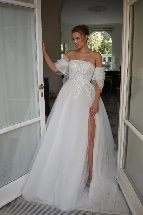 流暢 A 字裙擺: 裙身採用多層輕透的薄紗堆疊,呈現經典的 A-Line 剪裁。最具特色的是大膽的高開衩設計,在優雅的行走間隱約露腿,為傳統婚紗注入了現代性感元素。