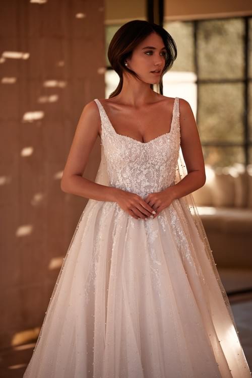 這款Armonia Nina婚紗是一款浪漫的A字裙,採用優雅的方形領口和寬肩帶設計,完美勾勒腰部線條。
