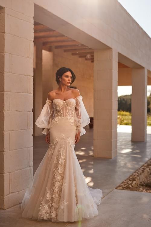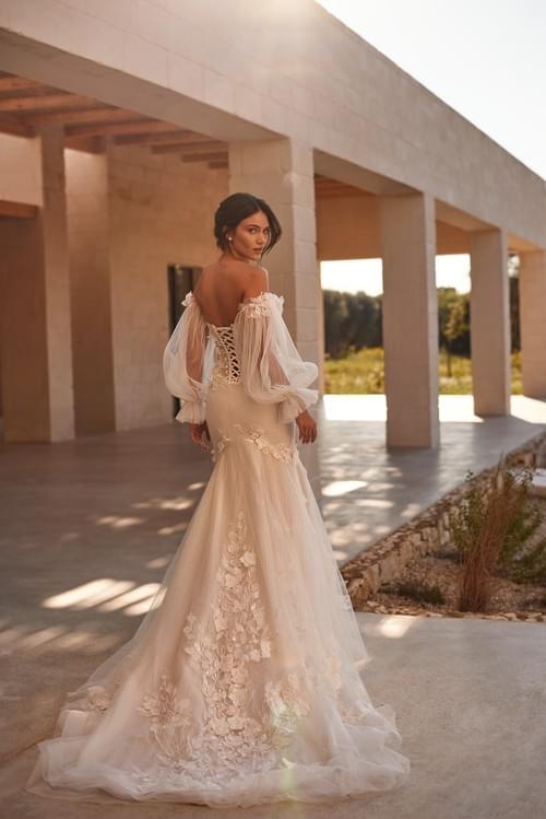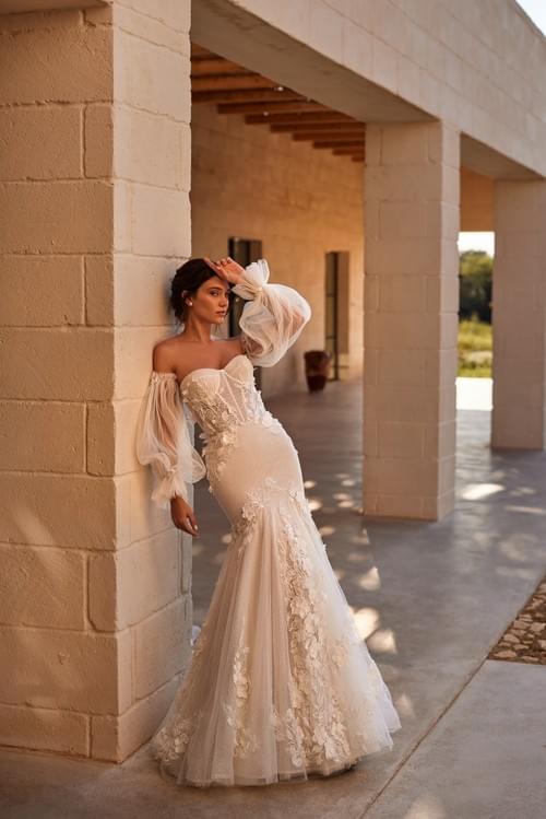 採用優雅的美人魚廓形,貼合身形至膝蓋處再向外展開,並飾有精緻的3D花卉蕾絲貼花及珠飾,增添層次感和光澤。