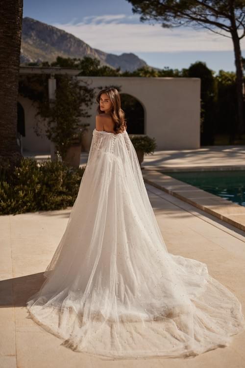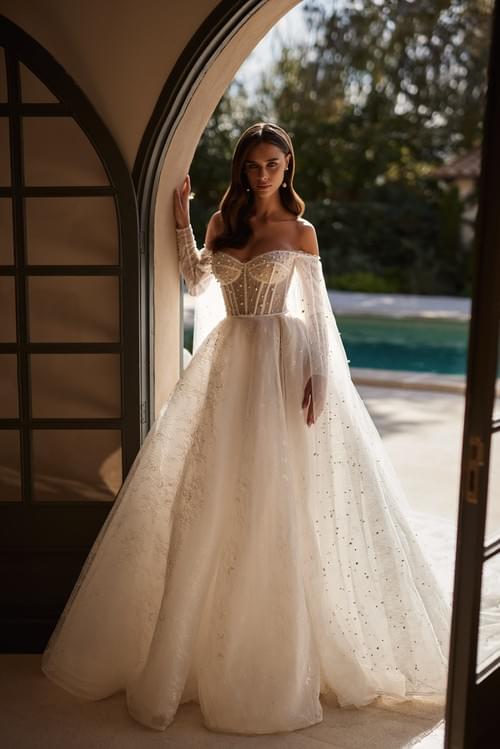 可拆卸的透視長袖,飾有珠飾和花邊,增添空靈感。
