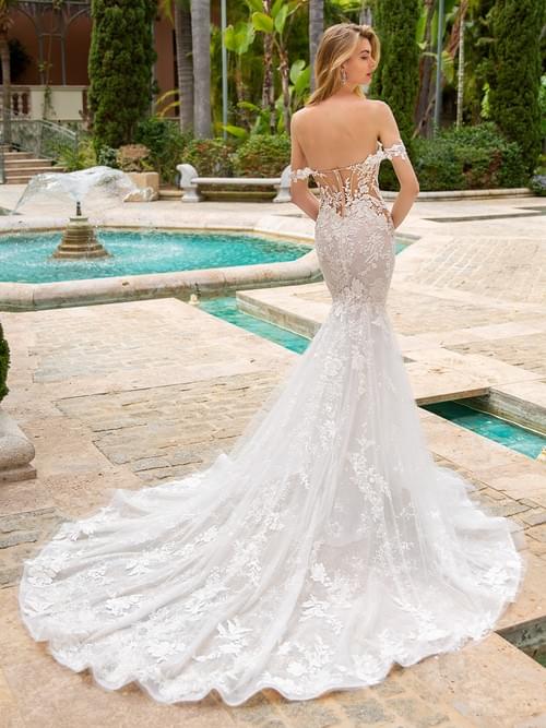 Enzoani Raquel 婚紗採用美人魚/魚尾廓形設計,以精緻的珠飾刺繡、3D 花卉蕾絲和閃亮薄紗層疊而成。