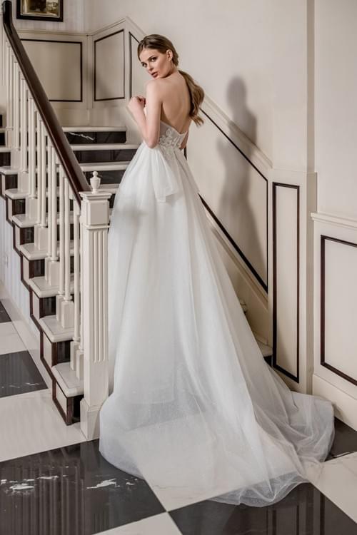 腰部以下的裙擺則選用輕盈的薄紗 (Tulle) 材質,並點綴微細的亮粉,讓整體在光線下呈現若隱若現的閃爍效果,營造出優雅、夢幻且現代的浪漫氣息。