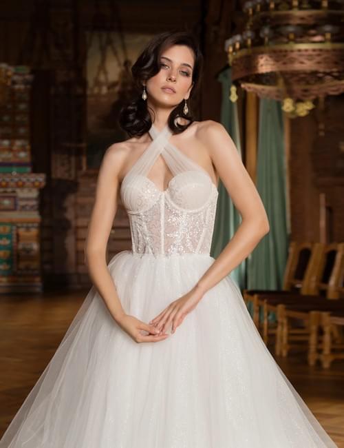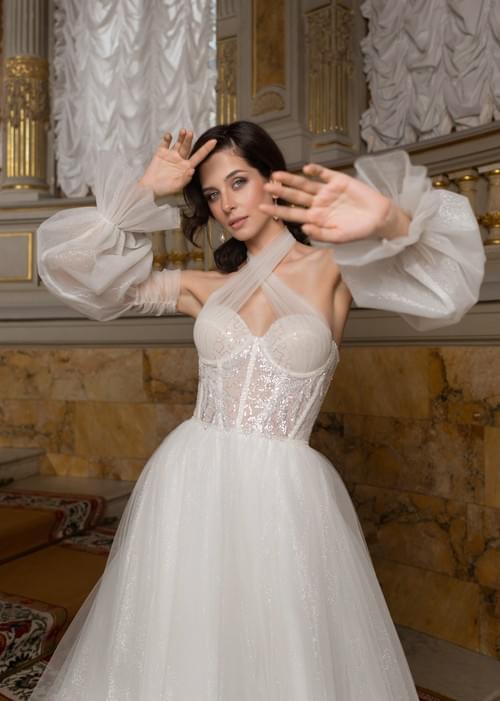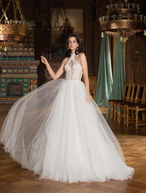 Marry Mark的Skaily又名Skyli婚紗以浪漫迷人的A字形輪廓為特色,採用透視緊身胸衣設計,並飾有精緻的刺繡花卉蕾絲貼花。