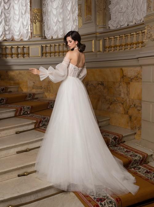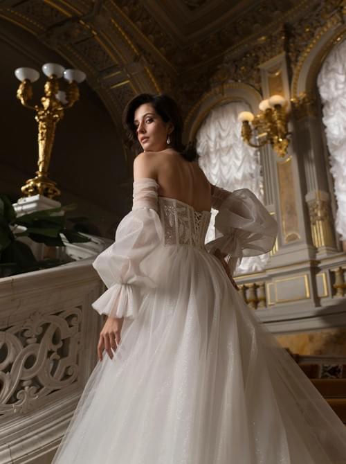 這件禮服最獨特的設計是其可拆卸的露肩泡泡袖,為新娘提供了兩種不同的造型選擇,既可以展現俐落的無肩帶心形領口,也可以營造出更柔美、夢幻的公主風格。