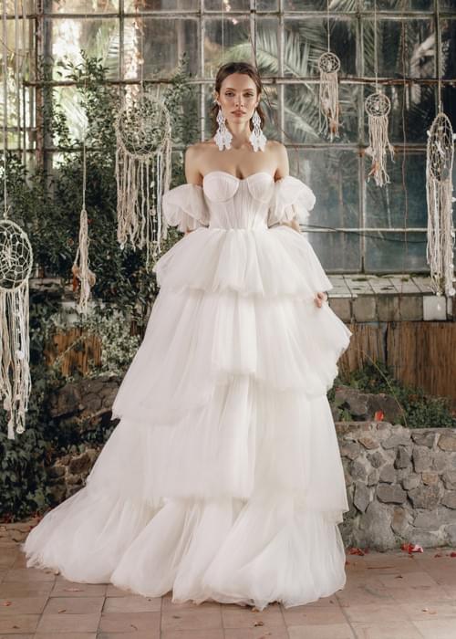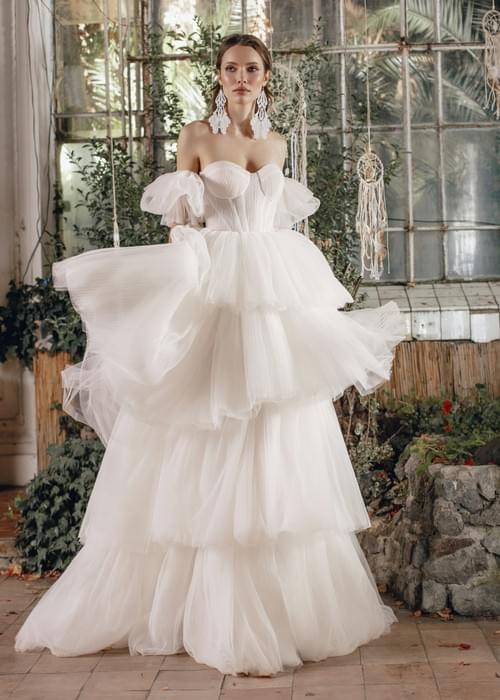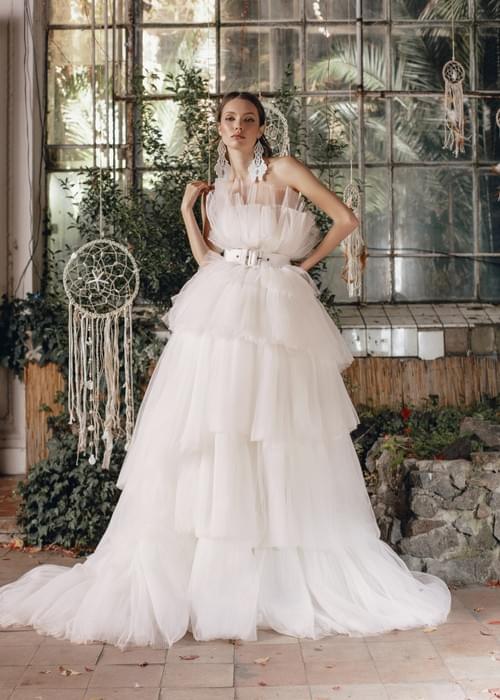 裙襬設計是A字形或舞會禮服廓形,由多層輕質薄紗堆疊而成的分層荷葉邊組成,營造出豐富的體積感和飄逸的流動感。