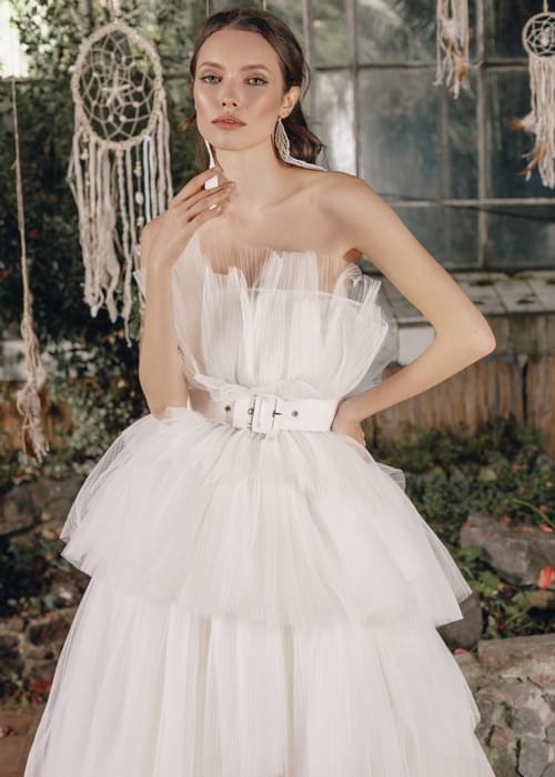 腰部飾有白色腰帶,為柔軟的薄紗設計增添了結構和視覺焦點。