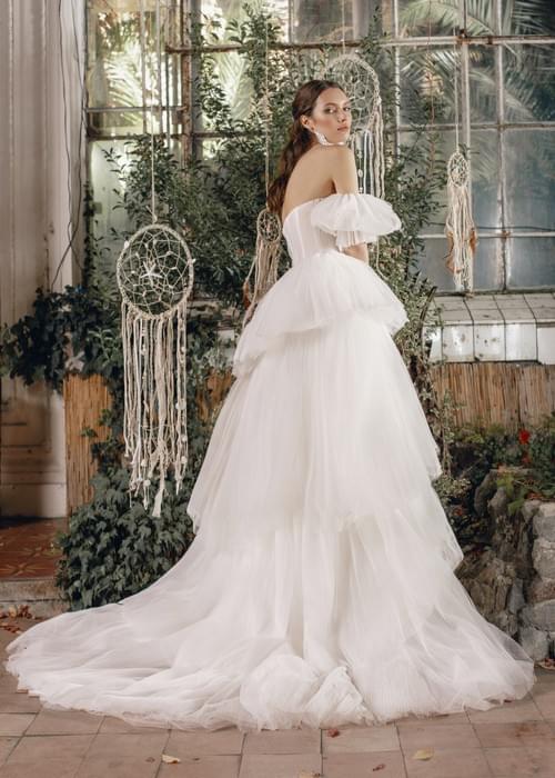 設計重點在於浪漫和戲劇性。 它採用無肩帶領口和褶皺緊身胸衣,完美地突顯了上半身。