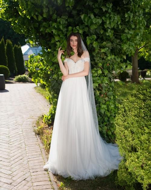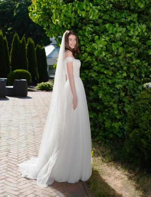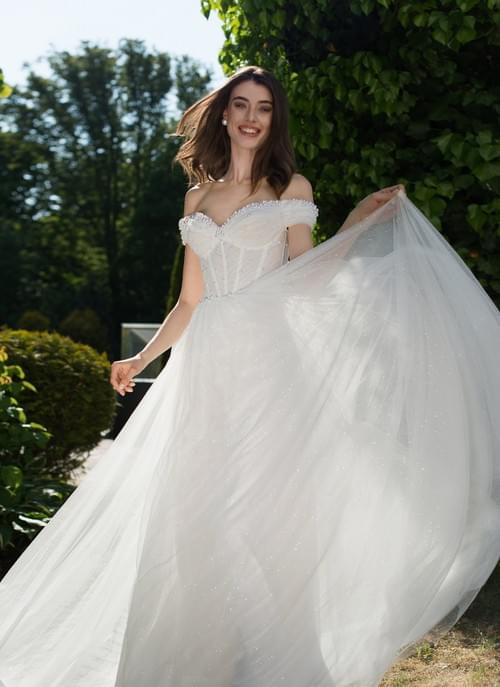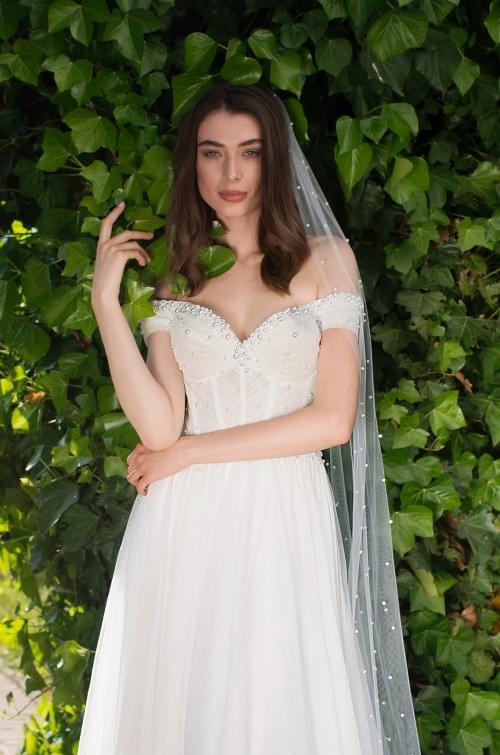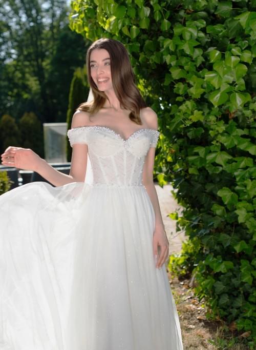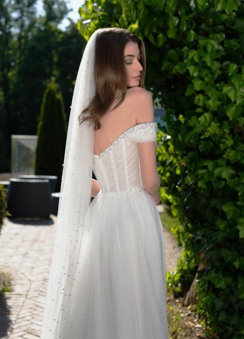採用迷人的露肩設計和心形領口。緊身胸衣採用現代馬甲風格,飾有珍珠和珠飾細節。