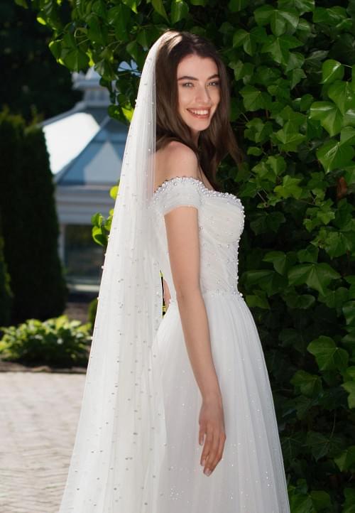 蓬鬆的裙子由閃閃發光的薄紗層疊而成,為這款適合現代婚禮的禮服增添了浪漫、永恆的氣息。
