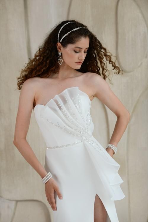 Marry Mark 品牌的「Vikki」婚紗,以其現代風格和精緻細節而聞名。這件禮服採用無肩帶設計,特色在於不對稱的緊身胸衣,飾有手工刺繡和串珠,裙身則有戲劇性的高開衩設計。它通常由柔軟的縐紗和歐根紗等材料製成,呈現出貼身的直筒或魚尾裙輪廓。
