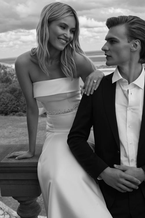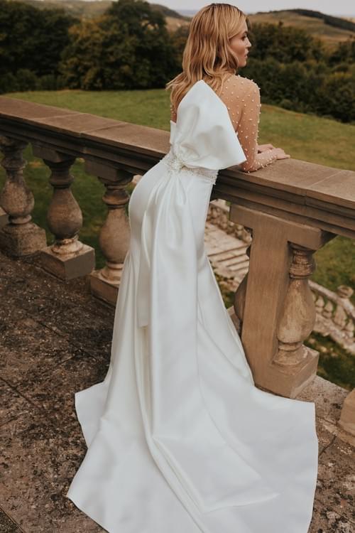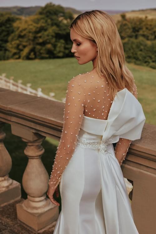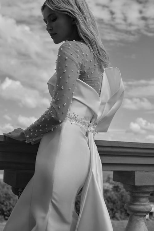 計為時尚的魚尾或修身剪裁款式,採用簡潔光滑的米卡多面料製成,完美勾勒出新娘的曲線。